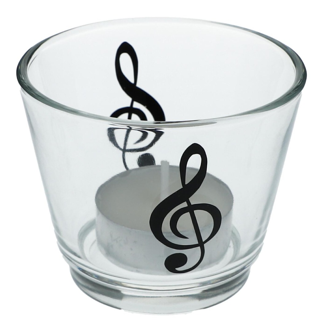 Waxinelichthouder van glas met zwarte opdruk van 2 vioolsleutels.