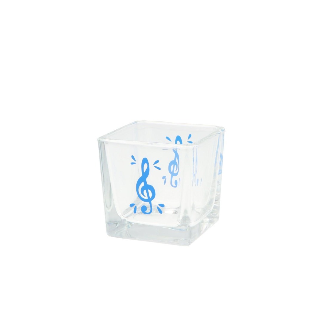 Waxinelichthouder van glas met opdruk van een vioolsleutel.