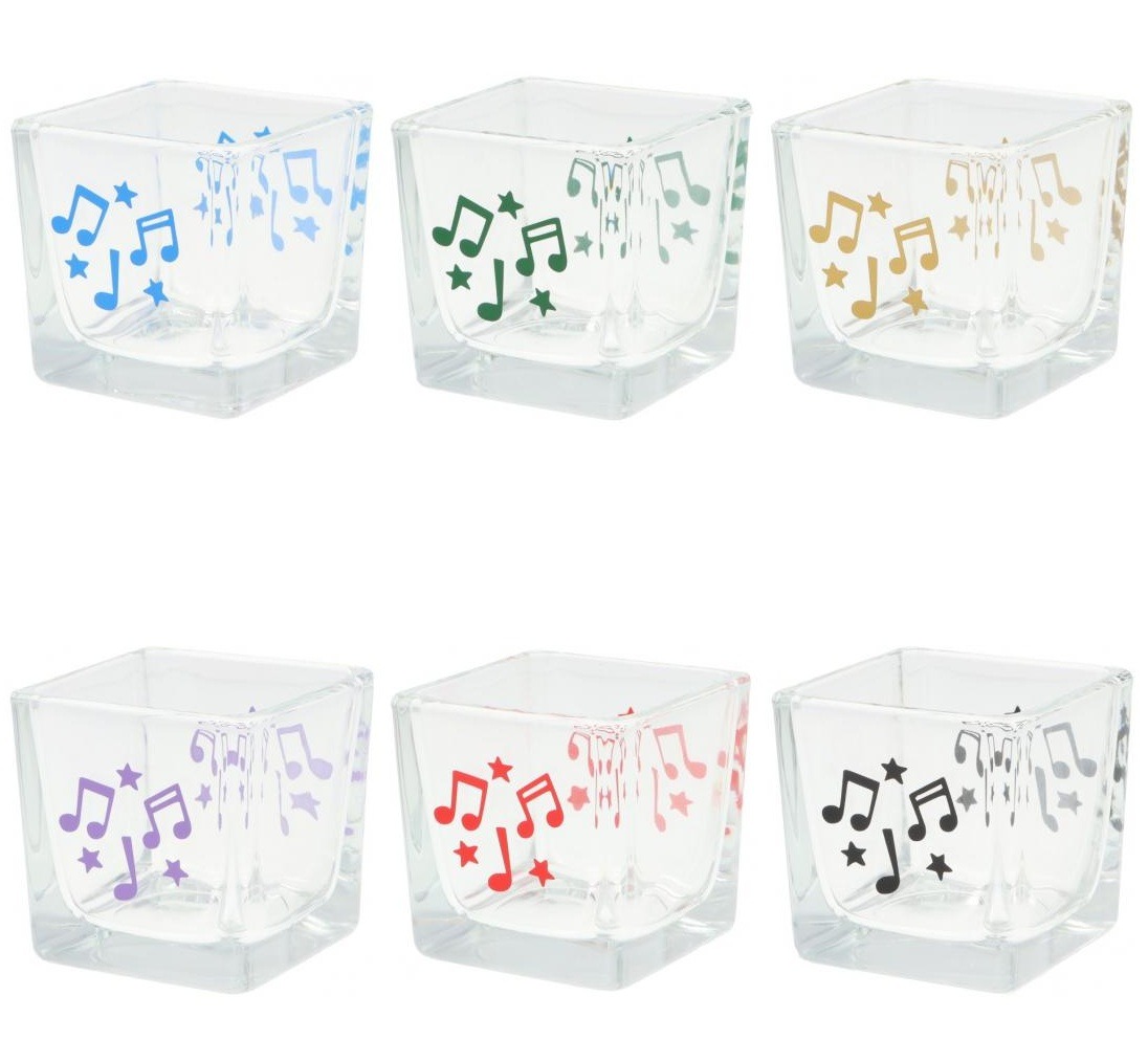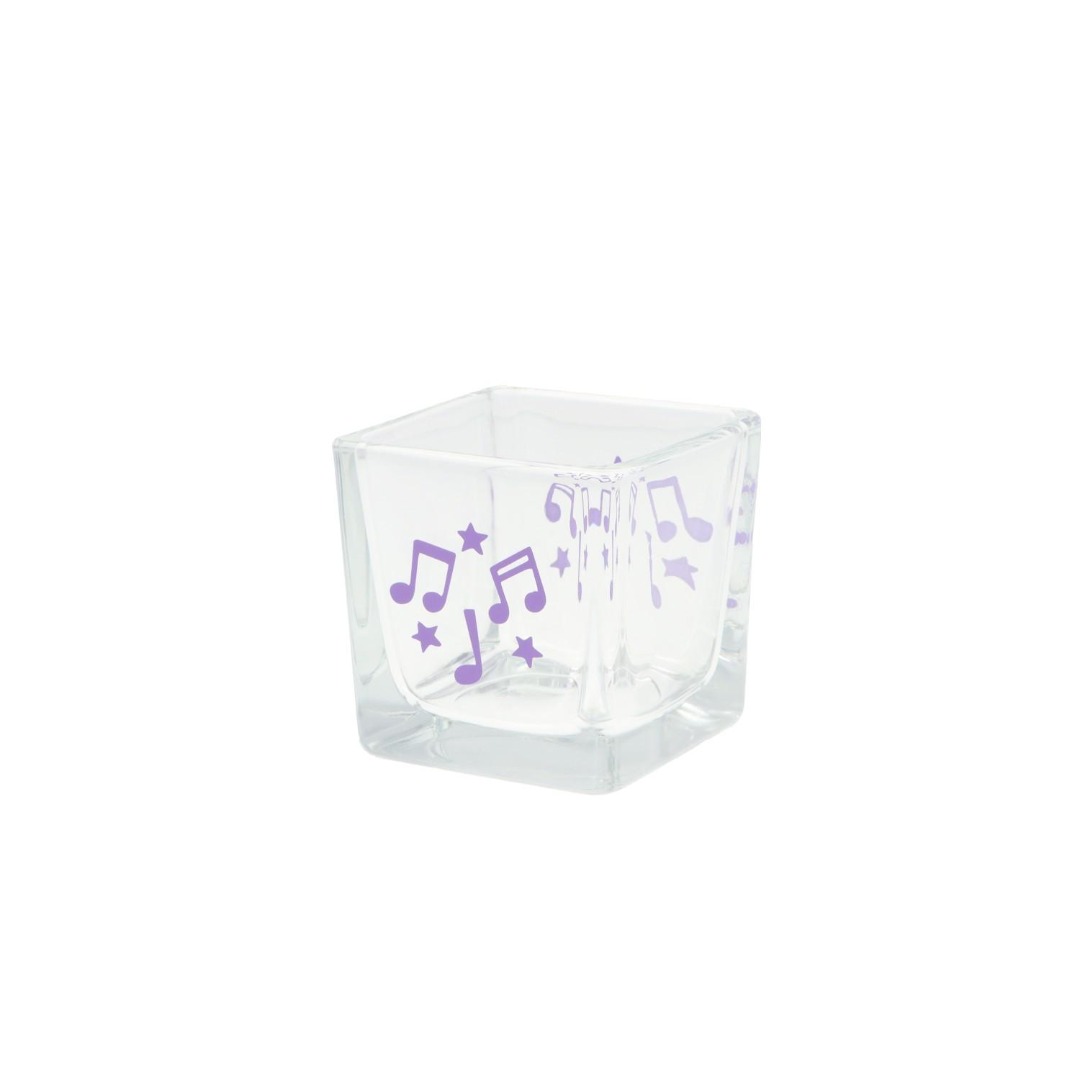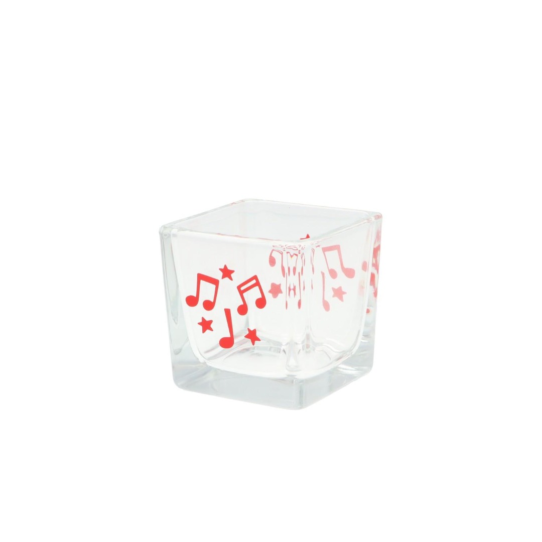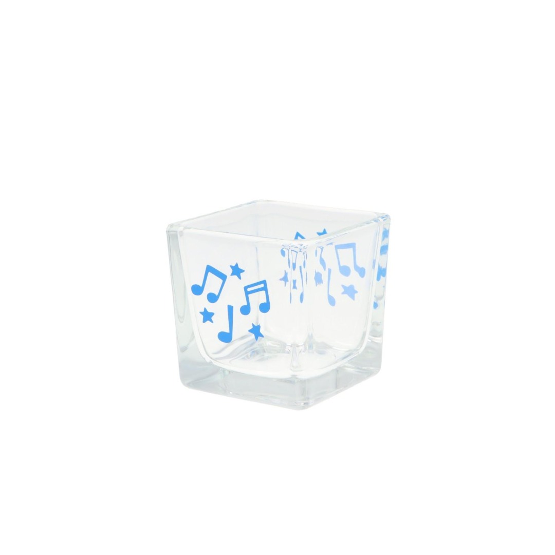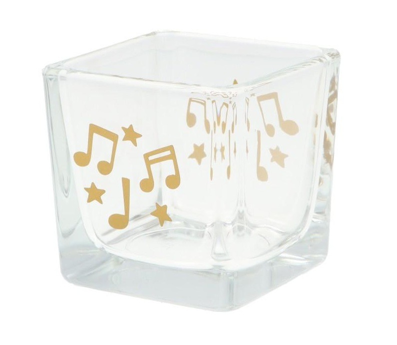 Waxinelichthouder van glas met opdruk van een muzieknoten en sterren.