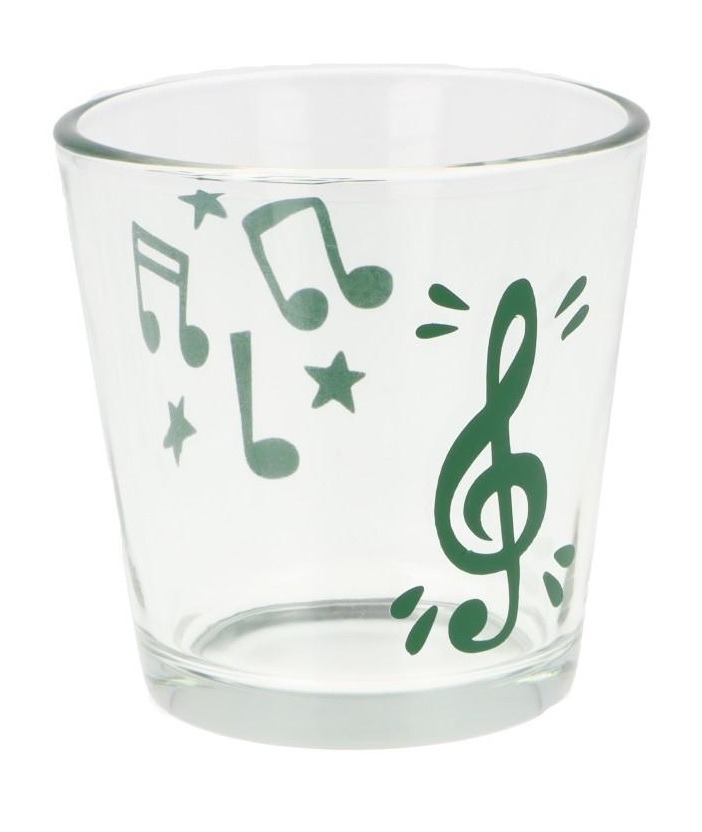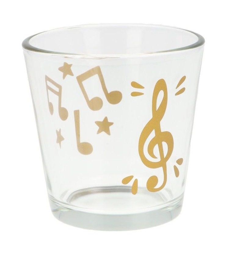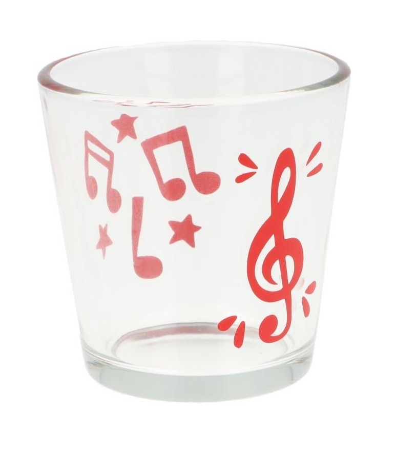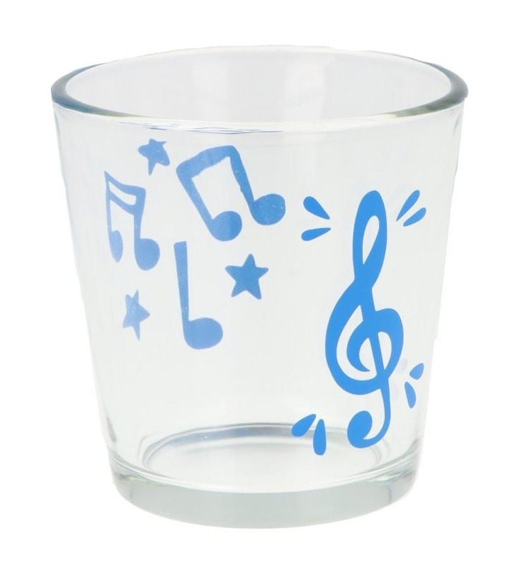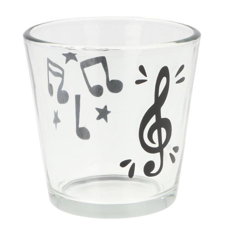 Waxinelichthouder van glas met opdruk van een vioolsleutel en muzieknoten met sterren.