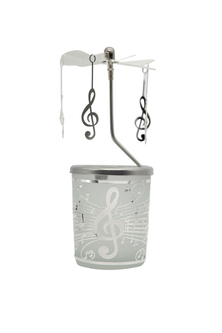 Waxinelichthouder van glas met metalen omhulsel met notenbalk met muzieknoten en grote vioolsleutel en bovenop een draaicarrousel met 5 hangers met vioolsleutels.