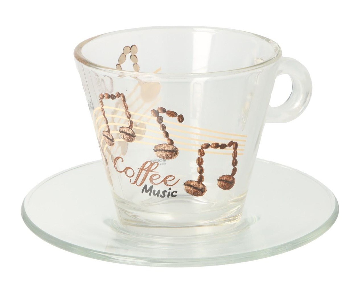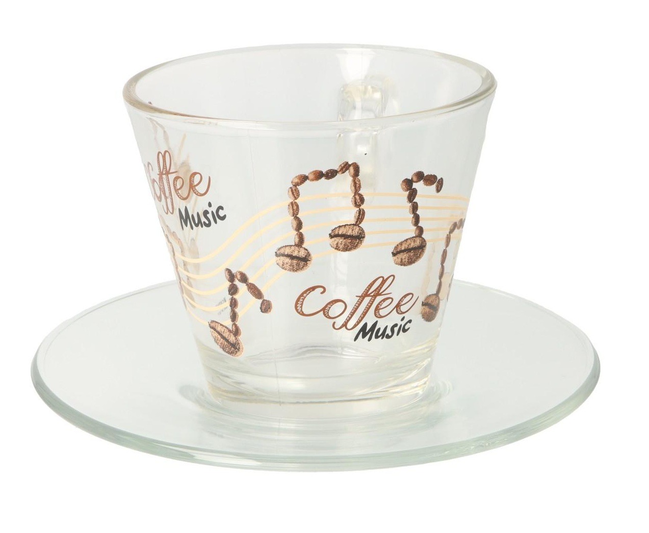Mooi cappuccino glas met schotel met opdruk van koffieboontjes in de vorm van een notenbalk met muzieknoten en de tekst "Coffee music".