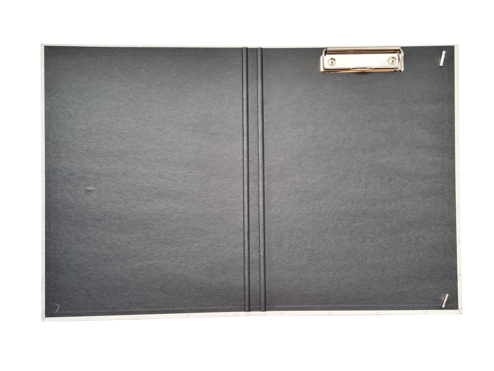 Handige klembordmap met elastiekband met opdruk van zilverkleurige muzieknoten en vioolsleutels om bijvoorbeeld bladmuziek of andere A4+ documenten in op te bergen.