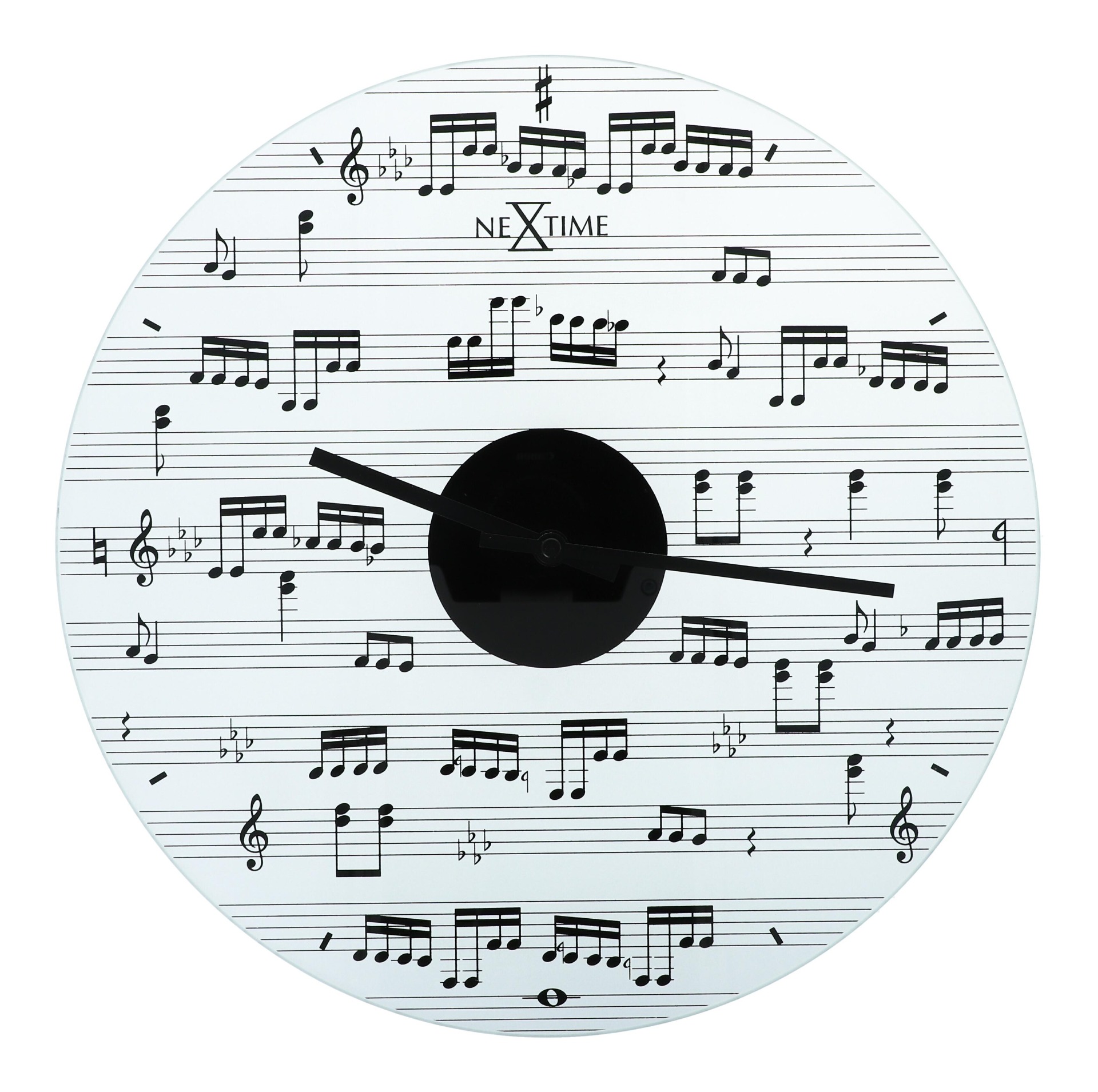 Unieke, stijlvolle wandklok van matglas met opdruk van notenbalken met muzieknoten.