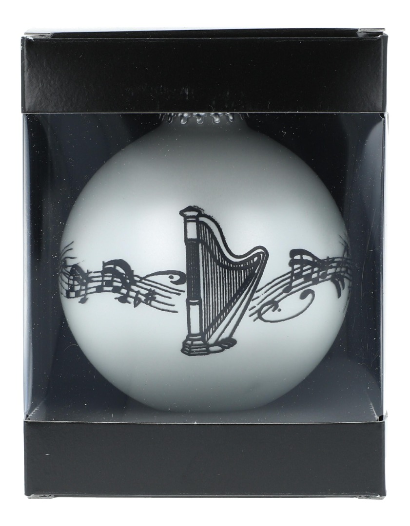 Mat witte kerstbal met opdruk van zwarte harp met notenbalk met muzieknoten.