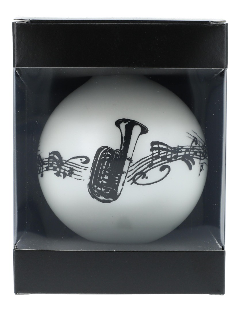 Mat witte kerstbal met opdruk van een zwarte bastuba met notenbalk met muzieknoten.