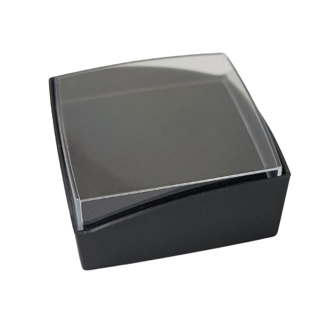 Met binnenin een kussentje om het sieraad op te leggen en een doorzichtig dekseltje.